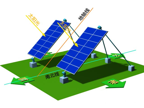 圖中是兩組平單軸跟蹤陣列示意圖,每塊電池陣列有自己的轉(zhuǎn)軸,轉(zhuǎn)軸線在與地面垂直的平面上,與地面有一個夾角,轉(zhuǎn)軸線與地軸線基本平行(春分或秋分時(shí)的地軸線)。轉(zhuǎn)軸安裝在支架上,電池陣列可繞自己的轉(zhuǎn)軸旋轉(zhuǎn),圖中黃色箭頭線表示太陽光的方向。旋轉(zhuǎn)由太陽跟蹤控制裝置控制,使電池板轉(zhuǎn)軸垂直面與太陽光平行.